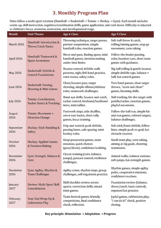 Through this program, children will build much more than physical strength. They will develop physical literacy, character, teamwork, confidence, decision-making, coordination, social skills, emotional strength, and lifelong healthy habits. At Daram-G, we believe physical education does not just build athletes. It builds capable, confident, and well-rounded children. Throughout the year, students will enjoy a carefully planned multi-sport rotation including Handball, Basketball, Tennis, Field Hockey, and Gym. Each unit is designed to match the children’s age, focus, motivation, and developmental stage, helping them improve step by step while enjoying active and meaningful learning experiences.