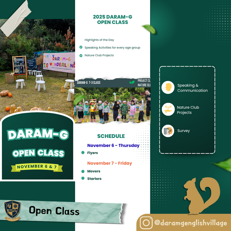 We are excited to announce our Daram-G Open Class 2025 a joyful celebration of learning, communication, and creativity! 🎉 This special event invites parents to step into their child’s classroom and experience their English learning journey firsthand. Through speaking and communication activities, and Nature Club projects, students will proudly showcase their confidence and growth. 🌱